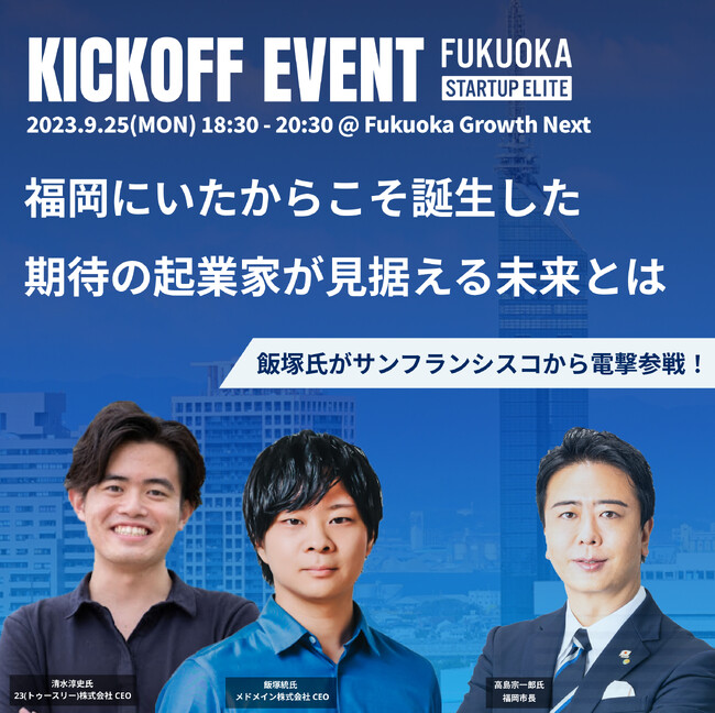 今回のイベントでは、23(トゥースリー)株式会社代表取締役CEOの清水淳史氏と、メドメイン株式会社代表取締役CEOの飯塚統氏、高島宗一郎 福岡市長によるパネルディスカッションを実施します。