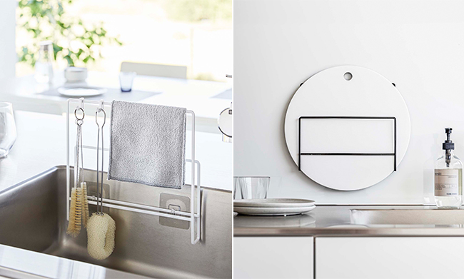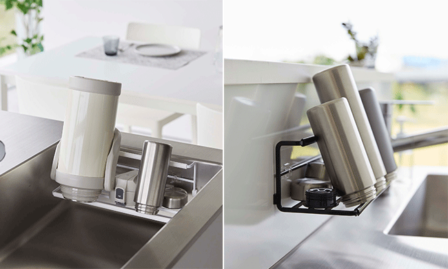 スリムに布巾やボトルブラシなどの長物も収納できるホルダー。