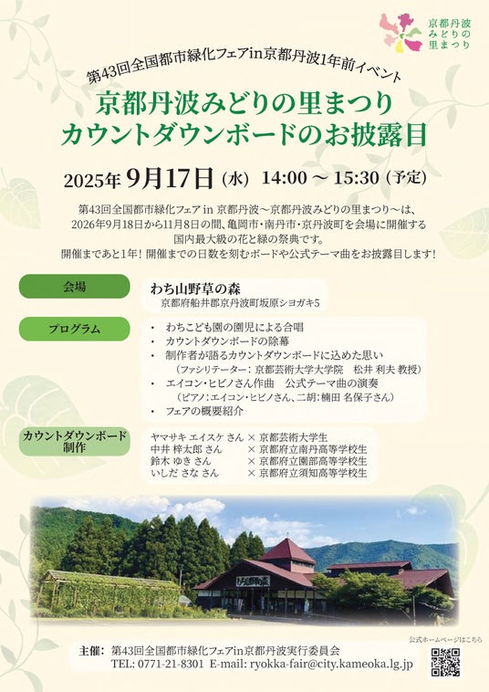 第43回全国都市緑化フェアin京都丹波実行委員会(会長:桂川孝裕・亀岡市長)は、令和8年9月18日のフェア開幕を1年後に控えた令和7年9月17日(水)に、1年前イベント「京都丹波みどりの里まつり カウントダウンボードのお披露目」を開催します。フェアのメイン会場の一つである、豊かな緑に囲まれた「わち山野草の森」(京都府船井郡京丹波町)にて、フェアのテーマ「食農と環境そしてアートで輝く『京都丹波』」を体現するカウントダウンボードを公開し、開催に向けた機運を醸成します。
