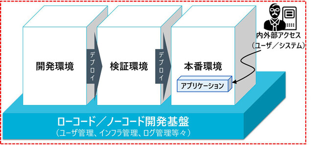 図:ローコード/ノーコード開発基盤のイメージと本サービスの対象範囲(点線部)