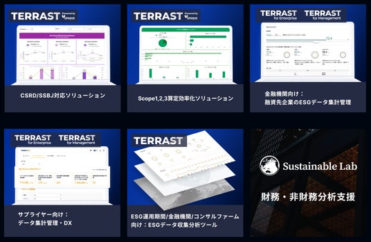 機関投資家・金融機関・プロファーム向け、国内最大級のESGデータ分析プラットフォーム「TERRAST」や、大手上場企業向け、ESGデータの開示・分析支援ソリューション「TERRAST powered by Uniqus」、中小企業/サプライヤー向け、ESGデータ集計・可視化ツール「TERRAST for Enterprise」、サステナブル企業名鑑「テラスTV」を提供する、ESGテックカンパニー。