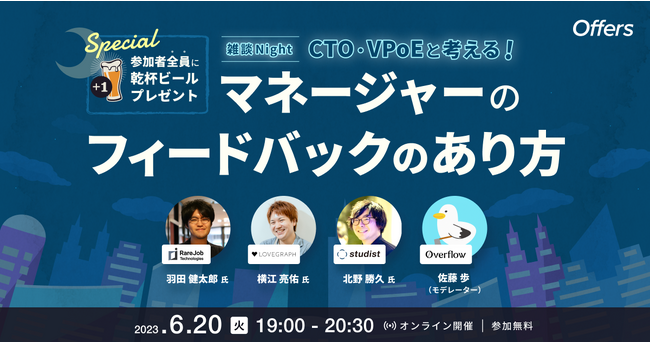 ITエンジニア/デザイナーの副業・転職サービス「Offers(オファーズ)」を運営する株式会社overflow(本社:東京都港区、代表取締役: 鈴木裕斗・田中慎 以下、overflow)は、2023年6月20日(火)19時から、ITエンジニア・デザイナーに向けたイベント「【雑談night】CTO・VPoEと考える!マネージャーのフィードバックのあり方」を開催することをお知らせします。株式会社レアジョブテクノロジーズ CTO 羽田 健太郎 氏、株式会社ラブグラフ 執行役員 CTO 横江 亮佑 氏、株式会社スタディスト 執行役員 VPoE 北野 勝久 氏をお招きし、フィードバックの考え方や気をつけていることなどについてお伺いします。