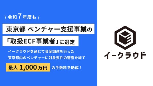 スタートアップと個人を結ぶ投資プラットフォームを運営するイークラウド株式会社は、東京都が実施する「クラウドファンディング(購入寄付型・株式型)を活用した資金調達支援」事業における、令和7年度「取扱ECF事業者」に選定されました。東京都内のベンチャー企業がイークラウドを通じて資金調達を実施した場合、対象要件の審査を経たうえで、東京都がECFの利用手数料をベンチャー企業に助成します。