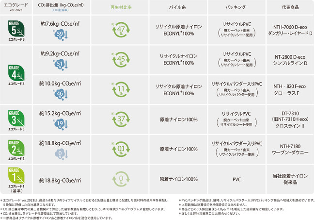 当社は、持続可能な社会の実現に向けて、長期ビジョン【DESIGN 2030】において「みんなで、いつまでも、楽しさあふれる」社会の実現を目指しています。商品開発においても環境に配慮した取り組みを進めており、前見本帳で設定した「エコグレード」を、より精緻化し、環境配慮ランク「エコグレード ver.2023」として再設定しました。「エコグレード ver.2023」は、商品1平方メートル あたりのライフサイクルにおけるCO2排出量と環境に配慮した原材料の使用率を検証し、5段階に評価した自社基準です。このうち、アクアフィル社製のリサイクル糸「エコニール (R)」をパイル糸に採用したカーペットタイルは、エコグレード「5」・「4」に値し、CO2排出量削減と環境汚染軽減に貢献しています。さらに、エコグレード「5」と、「4」の一部は、パイル糸・バッキングともにリサイクル素材を使用した「double eco」商品で、CO2排出量の大幅な削減と高い再生材比率を実現しました。