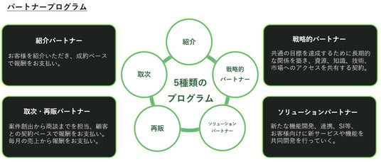 当社は戦略的パートナー、紹介パートナー、取次パートナー、再販パートナー、ソリューションパートナーの計5種類のパートナープログラムを用意し、自社のサービスおよび知見、技術をさらに拡張・発展させることを通じて、日本のGX・SXの加速を目指しています。パートナー企業各社のニーズに応じて最適なパートナーシップを築き、現在は約30社と協業しています。