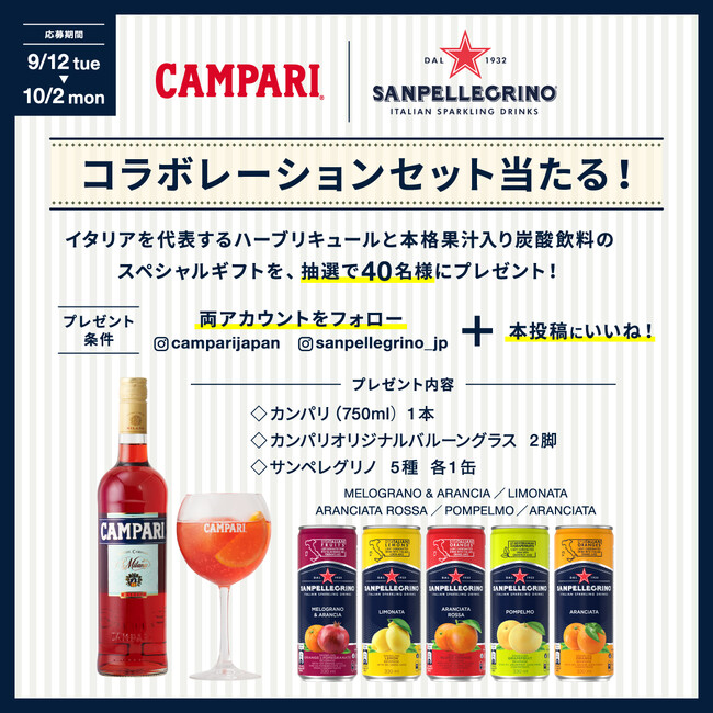 CT Spirits Japan(本社:東京都渋谷区/代表取締役社長:阿部 哲)が展開する、イタリアを代表するリキュールブランド「カンパリ」は、イタリア発の本格的な果汁入り炭酸飲料「サンペレグリノ」とコラボレーションしたInstagramキャンペーンを、2023年9月12日(火)から10月2日(月)まで実施いたします。