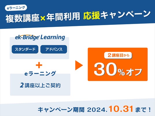 パナソニック ソリューションテクノロジー株式会社(本社:東京都、代表取締役社長:伊藤 一義/以下、パナソニック)は、2024年6月1日~2024年10月31日までの期間限定で、法人向けeラーニング講座サービス「ek-Bridge Learning」の【eラーニング複数講座×年間利用応援】キャンペーンを開始しました。年間を通して複数講座をご利用のお客様が、より多くの講座を気軽にお選びいただけるよう、2講座目以降は30%オフでeラーニングをご提供します。
