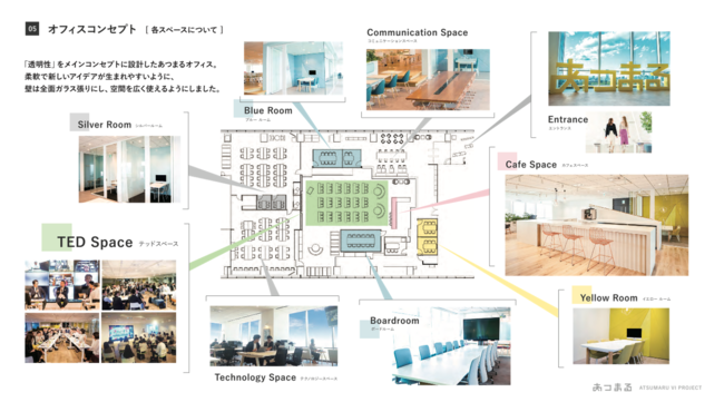 「透明性」をメインコンセプトに設計したあつまるオフィスの全体像は、下記をご参照ください。
