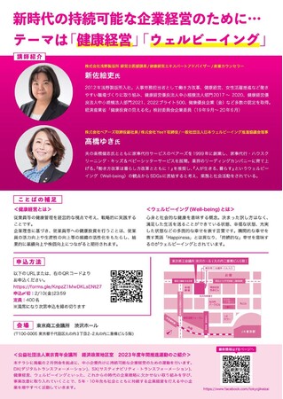 また、もう一人の講師として株式会社ベアーズ取締役副社長である高橋 ゆき氏も登壇。働き方改革と暮らし方改革を軸にしたウェルビーイングの観点から、従業員と企業が心身・社会的に健康である必要性をご講演頂きます。