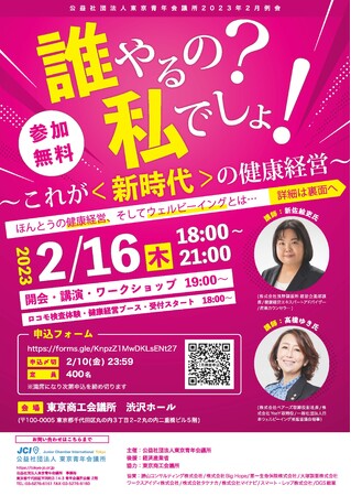 公益社団法人東京青年会議所 経済政策地区室(所在地:東京都千代田区平河町、理事長:下山田 敬介)は、2023年2月16日(木)19時~「誰やるの?私でしょ!~これが<新時代>の健康経営~」(東京商工会議所 渋沢ホール)にて開催いたします。