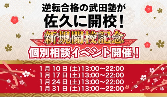学習塾「武田塾」を全国に展開している株式会社A.ver(本社:東京都文京区 以下「武田塾」)は、1月10日、長野県佐久市に武田塾佐久校を開校することをお知らせいたします。武田塾佐久校の開校を記念して、佐久校では個別相談イベントを実施いたします。開催予定は以下の通りです。1月10日(土) 13:00~22:001月17日(土) 13:00~22:001月24日(土) 13:00~22:001月31日(土) 13:00~22:00