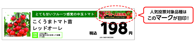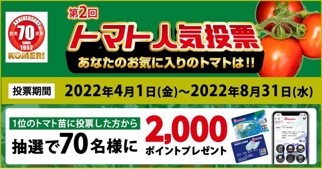 ミニトマトの1位に投票した方の中から抽選で40名様に、中玉・大玉トマトの1位に投票された方の中から抽選で各15名様の計70名様に、コメリのお買い物で1ポイント=1円としてお使いいただけるポイント、2,000ポイントをプレゼントいたします。