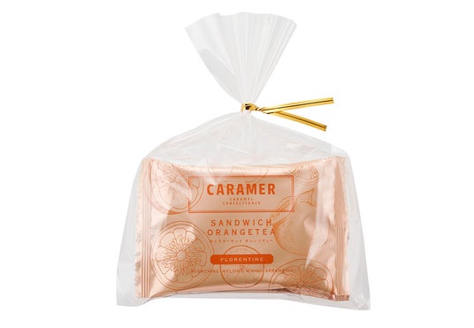 オレンジ果汁と華やかな香りのヌワラエリヤ産紅茶葉を合わせて炊き上げたとろけるキャラメルを、クーベルチュールチョコレートで包み込み、アーモンドフロランタンとバターサブレでサンドした新作「キャラマーサンド オレンジティー」。