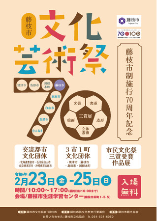 本市にゆかりのある都市の文化団体による作品を展示する交流都市芸術祭と合わせ、近隣市町文化団体の作品や、市民文化祭優秀作品を一堂に会して展示する「藤枝市文化芸術祭」を開催します。交流都市の伝統文化に触れることで、市民の文化力の向上と各交流都市との友好・文化交流の絆を強めることを目的としています。