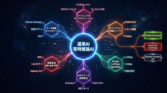 <知識グラフとルールベース推論を組み合わせて継続的に状況認識と意思決定を行う「常時推論AI」、データストリームと業務イベントに対してリアルタイムに応答する「ノンストップAI(Non-Stop AI)」、意思決定の証跡を永続的に記録する「台帳AI(Decision Ledger)」、そして「コンテキストAI」>--これらはすべて「運用AI」カテゴリーとして統合・確立される局面へ移行しつつある。