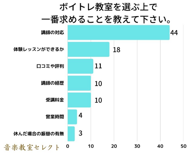 「ボイトレ教室を選ぶ上で一番求めることを教えて下さい。」とアンケート調査した結果、1位は『講師の対応』でした。