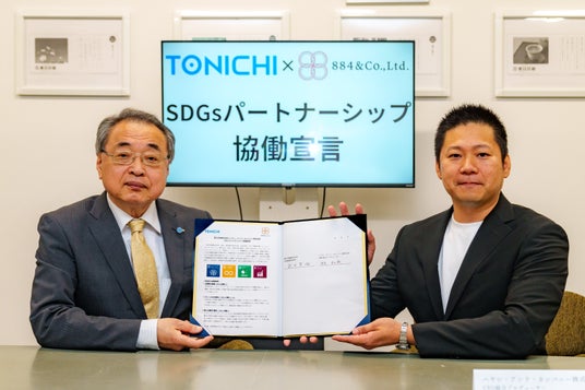 今年6月に提携した「SDGsパートナーシップ協働宣言」時の写真。【左】東日印刷の会長 武田芳明、【右】ハヤシ・アンド・カンパニーCEO総合プロデューサー 林和央