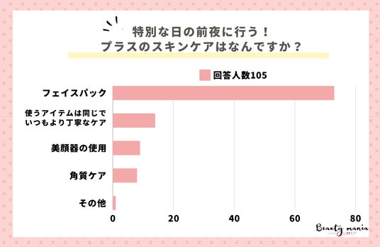 「特別な日の前夜に行うプラスのスキンケアは?」というテーマで105人にアンケートを行ったところ、「フェイスパック」と回答したのは全体の69.5%でした。