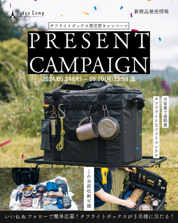 合同会社DRive(本社:大阪府箕面市、代表:吉川了)が運営するキャンプブランド『TokyoCamp(トーキョーキャンプ)』は、2024年5月14日(火)12時~5月20日(月)まで、新商品のソフトコンテナ「タフライトボックス」のプレゼントキャンペーンを開催いたします。