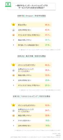 一番好きと回答したインターネットショッピングのサービスの上位3位について、それぞれ好きな理由を聞きました。