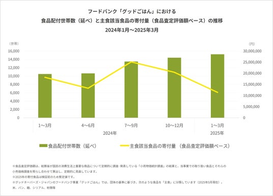 フードバンク「グッドごはん」における食品配付世帯数(延べ)と主食該当食品の寄付量(食品査定評価額ベース)の推移 2024年1月~2025年3月