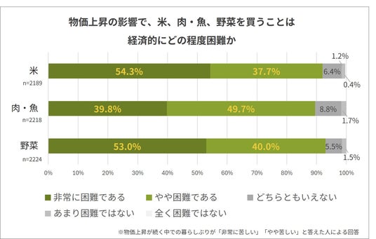 物価上昇の影響で、米、肉・魚、野菜を買うことは経済的にどの程度困難か
