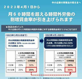 -2023年4月1日より、中小企業の月60時間超の時間外労働に対する割増賃金率が50%に引き上げられます(中小企業に対する猶予措置の終了)