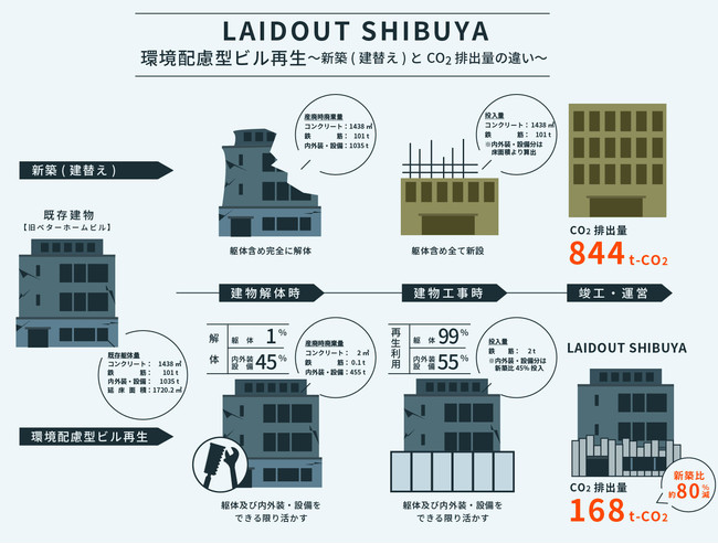 ~渋谷のワークプレイス「LAIDOUT SHIBUYA」にてCO2排出量を初測定 既存建物を同規模の新築に建替えた場合と比較してCO2排出量を約80%削減~