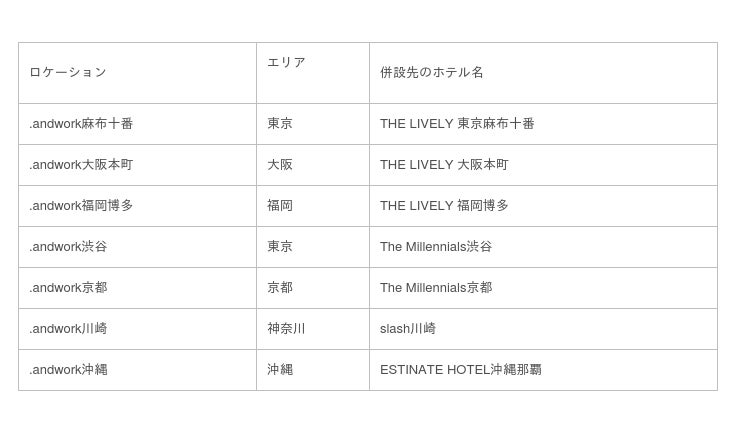 WORK:ホテル一体型ワーキングプレイス「.andwork」を運営 (https://www.xandwork.com/)