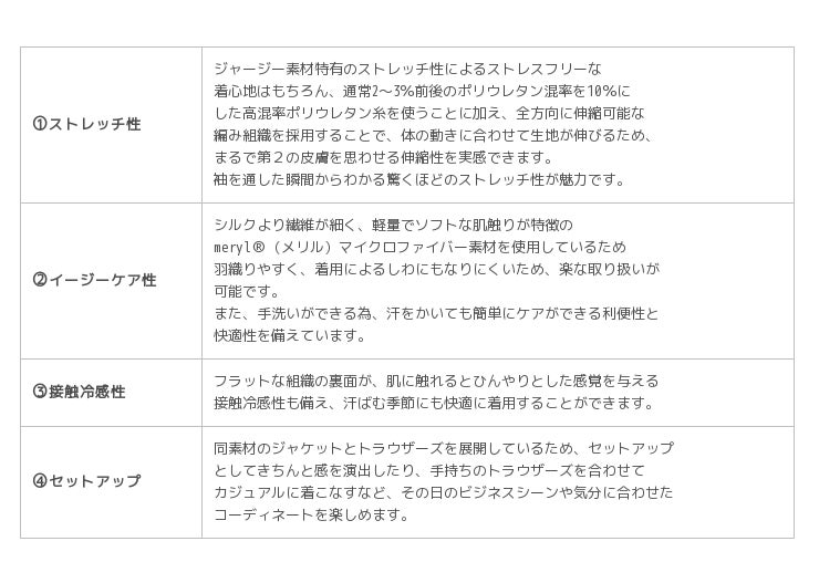素材は、表、裏で見え方の違う特殊な縦編みにより、表面は織物のような綾組織、裏面はフラットな組織により滑りの良い肌触りとなっています。さらに、フラットな組織の裏面が、肌に触れるとひんやりとした感覚を与える接触冷感性も備え、真夏を迎えるこれからの時期にも快適に着用できます。