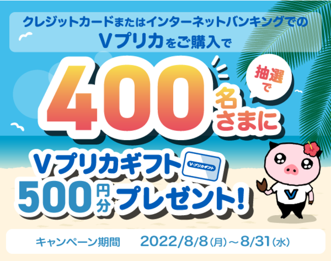 クレジットカードまたはインターネットバンキングでVプリカを購入し応募すると、抽選で400名さまにVプリカギフト500円分プレゼント!