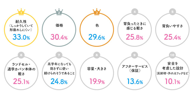 GIGAスクール構想によりタブレット端末やパソコンを持ち運ぶ機会が増えたことで、ランドセルに入れる教材や荷物の重さへの関心が高まってはいますが、6年間使用するものなので「耐久性」が1位という結果に。また「価格」や「色」に次いで「背負ったときに感じる軽さ」や「本体の軽さ」といった「軽さ」に関する項目が重視点として上位にランクインしました。