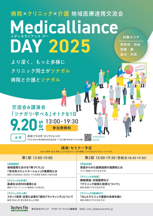 クリニックのDXによって地域医療サービスの向上に貢献する、株式会社ギミック(本社:東京都渋谷区、代表取締役:横嶋 大輔、以下「当社」)は、都内6区から病院・クリニック・介護関係者が一挙に集う地域医療連携交流会「メディカライアンスDAY 2025」を、2025年9月20日(土)に初開催します。