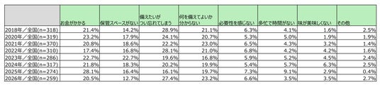 2024~2025年は「お金がかかる」が最多でしたが、2026年は「つい忘れてしまう」(27.4%)が最多となりました。「お金がかかる」は2025年の28.1%から2026年は20.5%へ低下する一方、「つい忘れてしまう」は16.1%から27.4%へ上昇しており、費用面よりも“備えの習慣化”が壁になっている可能性がうかがえます。