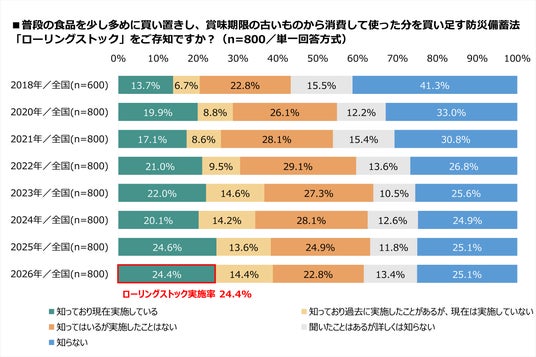 日常的に食品を多めに備え「買い足し、期限の古いものを先に使い、新しいものを買い足す」防災備蓄法「ローリングストック」について聞いたところ、「知っており現在実施している」は24.4%で前年(24.6%)とほぼ同水準でした。