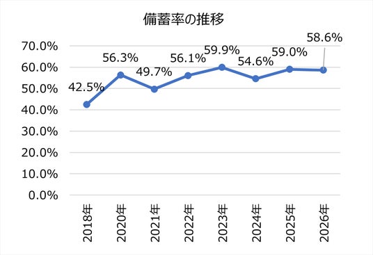 防災食(非常食)の備蓄率は2018年の42.5%から上昇傾向が続き、2023年に59.9%と過去最高を記録しました。しかし、その後は2024年54.6%、2025年59.0%、2026年58.6%と54~59%台で推移しており、6割の大台を一度も超えられないまま頭打ちの傾向が見られます。