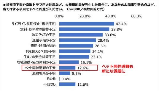 ■大規模地震への懸念トップは「ライフライン停止」42.4%、「ペット同伴避難」にも不安12.6%
