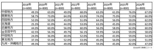 地域別でみると、中部地方が67.0%で最も高く、関東地方66.0%、四国地方・北海道がともに62.0%と続きました。一方、九州・沖縄地方は47.0%と全国で唯一5割を下回り、最も高い中部地方との差は20ポイントに達しています。