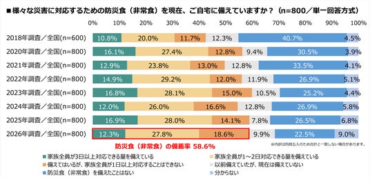 防災食(非常食)の備蓄状況について聞いたところ、「家族全員が3日以上対応できる量を備えている」(12.3%)、「家族全員が1~2日分対応できる量を備えている」(27.8%)、「備えてはいるが、家族全員が1日以上対応することはできない」(18.6%)を合わせた備蓄率は58.6%となりました。過去最高だった2023年の59.9%にも及ばず、2018年以降一度も6割を超えていません。また、政府や自治体が推奨する「最低3日分」の備蓄を行っている家庭は12.3%にとどまり、備蓄の「率」だけでなく「量」にもまだ課題が残ります。