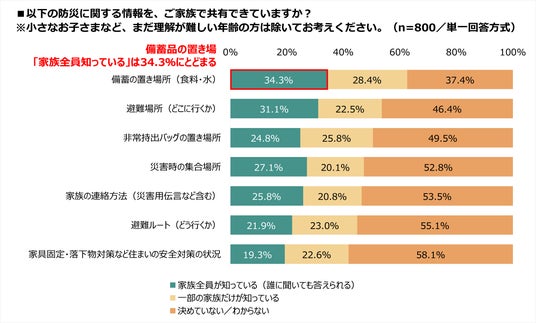 「家族全員が知っている」と回答した割合は、最も高い「備蓄の置き場所」でも34.3%にとどまり、「避難ルート」は21.9%、「家具固定・安全対策の状況」は19.3%と2割を下回る結果となりました。