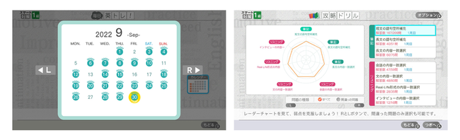 日々の学習記録がカレンダーに一覧表示され、合格不合格の目安とともにレーダーチャートで弱点が把握できます。苦手な問題を重点的に復習することで効率的に学力アップをサポートします。