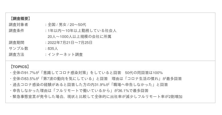 そこでJob総研では社会人835人の男女を対象に、現コロナ対策の意識度、感染対策の具体的内容、第7波への関心度、コロナ感染経験と職場への申告有無などを含め現状の出社率及び、今後緊急事態宣言が発令された場合の予定出社頻度などについて調査した「2022年 コロナ感染に関する意識調査」を実施しました。