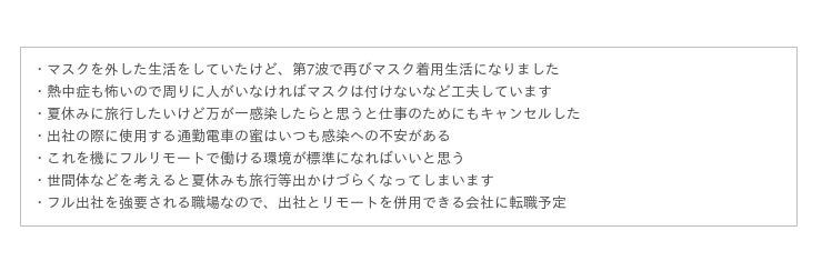 コロナ禍が影響した働き方やプライベートの過ごし方など様々なコメントが寄せられました。