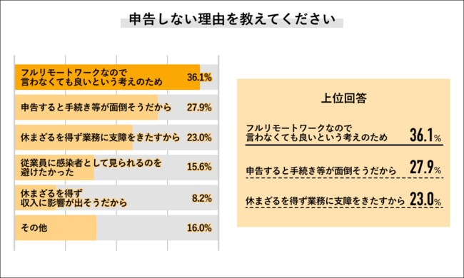 「過去に感染経験も疑う症状もない」と回答した550人の内今後コロナに感染した場合に職場への申告をするかについて聞くと「申告しない」は5.6%の回答結果になりました。過去の感染で「申告しなかった」の回答含めて、その理由について聞くと「フルリモートワークなので申告しなくても良いという考え」36.1%が最多回答になり、次いで「申告すると手続きが面倒そうだから」が27.9%、「休まざるを得なくなり業務に支障をきたすから」が23.0%で上位3つの回答結果になりました。