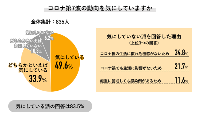 コロナ第7波の動向関心度については「気にしている」49.6%、「どちらかといえば気にしている」33.9%を合算した83.5%が“気にしている派”の回答になり”気にしていな派”は16.5%でした。