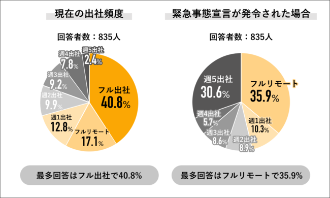 また今後緊急事態宣言が発令された場合の働き方について聞くと「フルリモート」が35.9%で、現状のフルリモートから約2割増加する回答結果になりました。