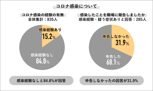 同調査の回答者835人において「過去コロナに感染した経験がある」と回答したのは全体の15.2%(208人)で、その内「感染を職場へ申告しなかった」と回答したのは31.9%でした。