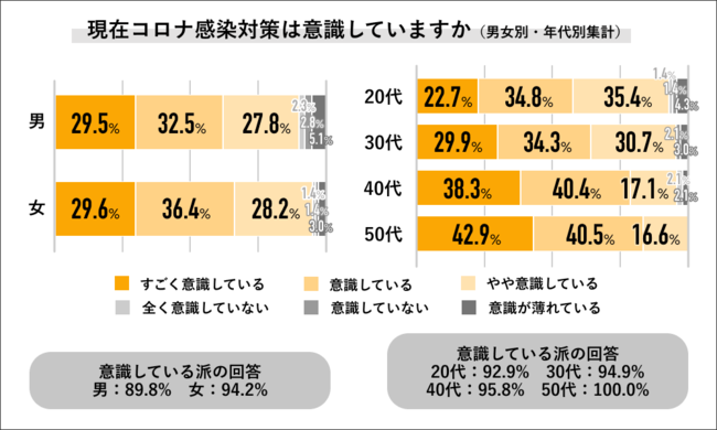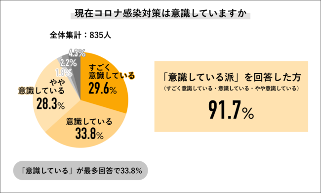 意識してコロナ感染対策をしているかについて、「すごく意識している」29.6%、「意識している」33.8%、「やや意識している」28.3%を合算した91.7%が“意識している派”の回答をしました。