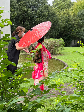 撮影当日は雨予報でしたが、幸いにも天気に恵まれ心地良い気候の中で撮影が行われました。最初は慣れないきものに緊張した様子でしたが、関係者の皆様に見守られ終始和やかな雰囲気で進みました。