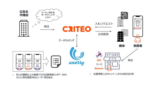 コマースメディアを展開するCriteo(クリテオ、本社:フランス、日本代表取締役:グレース・フロム、以下Criteo)と株式会社unerry(ウネリー、本社:東京都港区、代表取締役社長CEO:内山 英俊、以下unerry)は、実店舗における集客支援において協業することを発表します。協業を通じ、unerryのリアル行動(位置情報)データとCriteoのオンラインのコマース(消費行動)データをマッチさせ、効率的かつ効果測定が可能な店舗集客型デジタル広告を広告主に提供することが可能となります。
